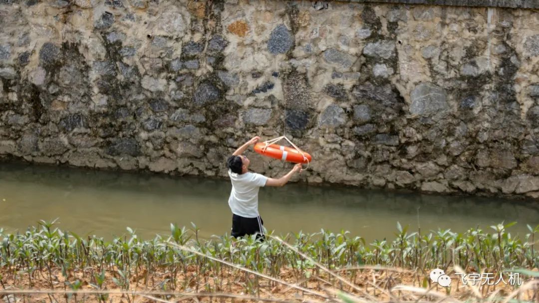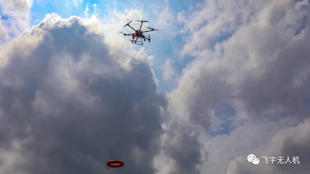 二、模拟洪灾被困人员救援,巡逻侦查无人机穿云鸟发现附件河道内有被困人员求救信息,指挥中心马上锁定被困人员定位信息,迅速派出飞宇警用消防大六轴无人机进行救援,该无人机分别有15公斤载重抛投(可搭载救援物资进行高空抛投)、喊话器(对施救人员进行心里安抚、远程沟通协调)、红外双光吊舱、高空照明灯(夜间夜间提供高空照明),在发现落水人员后,救援指挥中心首先派出系留无人机搭载30倍变焦镜头+4G图传,实时传输图像回救援指挥中心,指挥中心马上派出救援无人机,搭载救生圈进行抛投,成功救出落水被困人员。