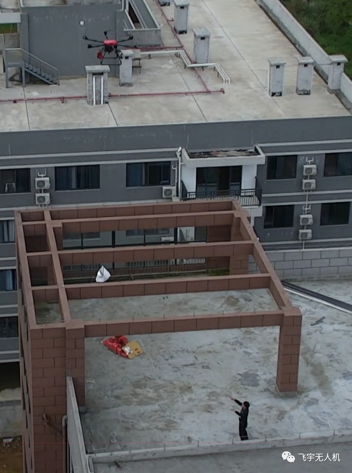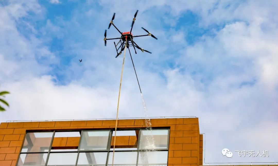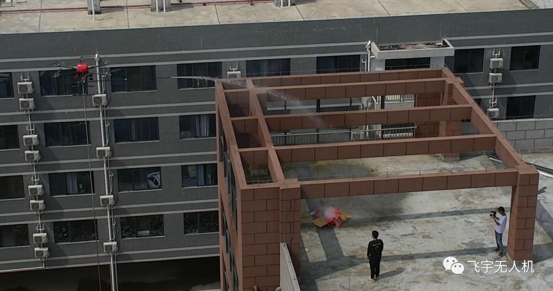 四、模拟楼房失火,巡逻侦查穿云鸟发现有一处高楼层浓烟滚滚,进行盘旋锁定后发现窗户处有人求救信息,指挥中心派出飞宇大载重无人机搭载高压水枪链接消防栓利用压强原理进行高空喷水灭火,该无人解决了高楼层失火时也能及时进行灭火救援的问题。高压水枪喷射距离最远可达10米!并派出警用消防大六轴无人机对被困人员进行心里的安抚以及运输安全帽、湿毛巾、饮用水等物资。最后在指挥中心与灭火无人机的配合下,成功灭火救出被困人员,并进行灭火。