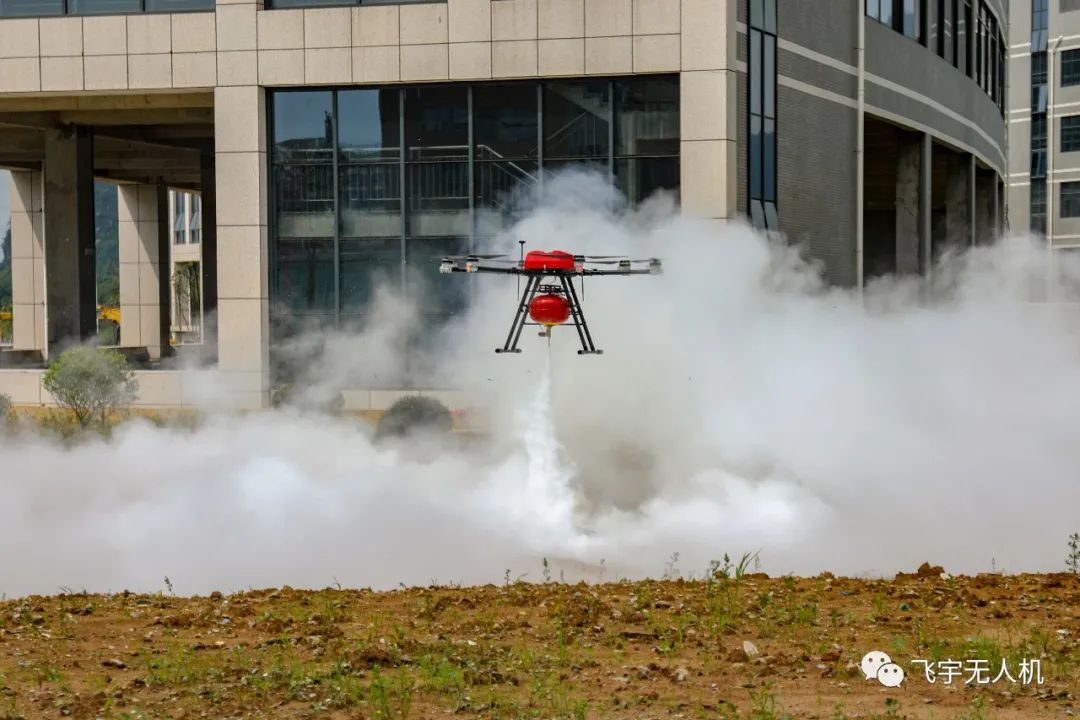 三、模拟森林火灾救援,巡逻侦查穿云鸟发现有一处森林着火点,指挥中心收到信息派出飞宇大载重灭火无人机进行干粉灭火救援。该无人机可载重12kg灭火干粉或100米2.0MPA消防水带在火势较大的情况下也能高效地进行灭火。