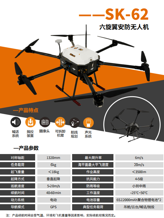 数字鹰SK-62无人机,可根据客户实际需求搭配光电吊舱或高清云台、喊话系统等专业挂载。产品一键电启动,使用便捷,可靠性高,可广泛用于执行空中图像采集与传输等任务。