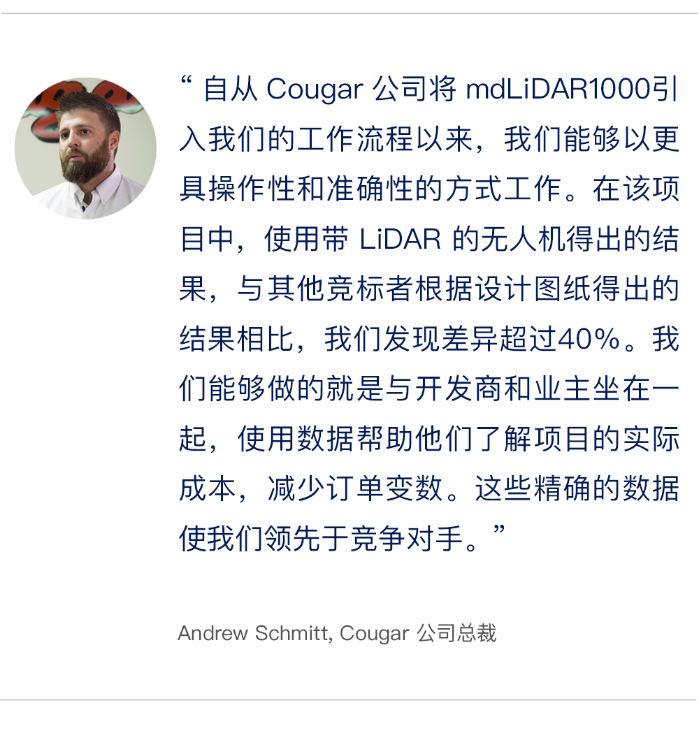 收集完数据,Cougar 团队首先使用 mdInfinity 数据平台的轨迹处理和地理配准模块处理了原始点云,然后采用 mdInfinity 的其它模块进一步调整航带,消除离群值和进行点云地面分类。将数据成果与原始设计图进行对比,即可计算需要往施工现场运输多少材料。“我们有多个通过使用 Microdrones 无人机测量技术取得项目成功的案例,因为它能为客户和工程师提供准确的数据,从而消除客户对于使用无人机这种昂贵设备的疑虑。”Cougar 公司的总裁 Andrew Schmitt(安德鲁·施密特)介绍道。