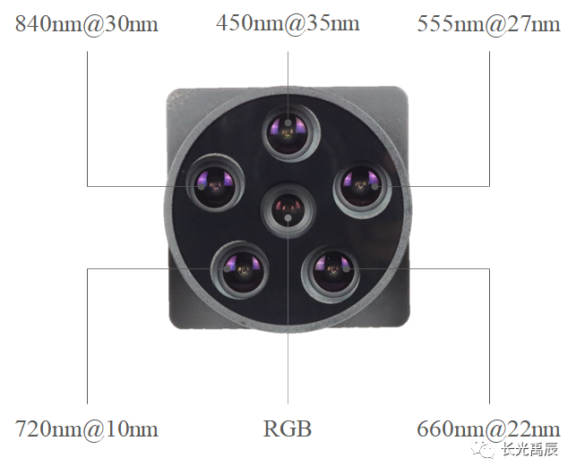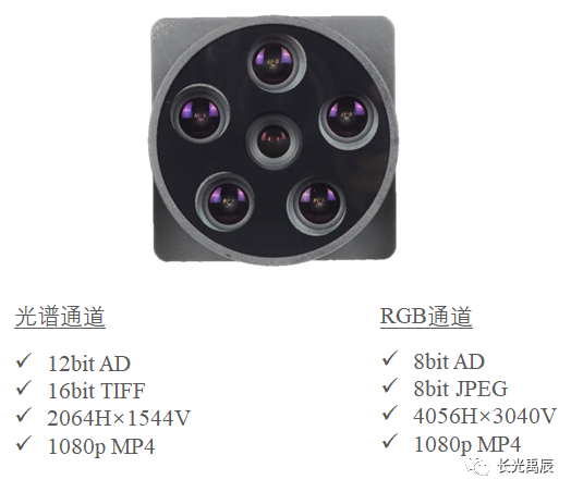 5个3.2M像素多光谱(像元大小 3.45μm,12bit量化全局快门)+1个12.3M像素RGB(像元大小 1.55μm,8bit量化卷帘快门)的通道组配,显著提升了科研和行业用户的信息获取量,更加适合“光谱+AI”的应用场景,也预示着“光谱视觉”新时代已经到来。