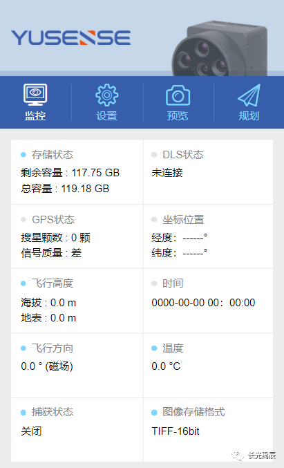 AQ系列多光谱相机延续长光禹辰MS600系列多光谱相机的人机交互风格,AQ600多光谱相机内置WEB服务器,用户可使用手机、平板电脑等移动终端通过WIFI访问连接相机,在网页浏览器上设置相机的工作参数、查看相机的工作状态。