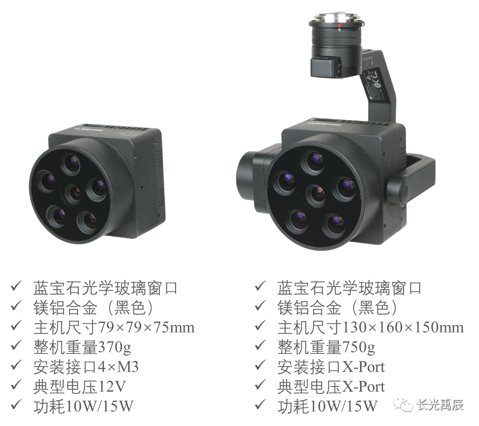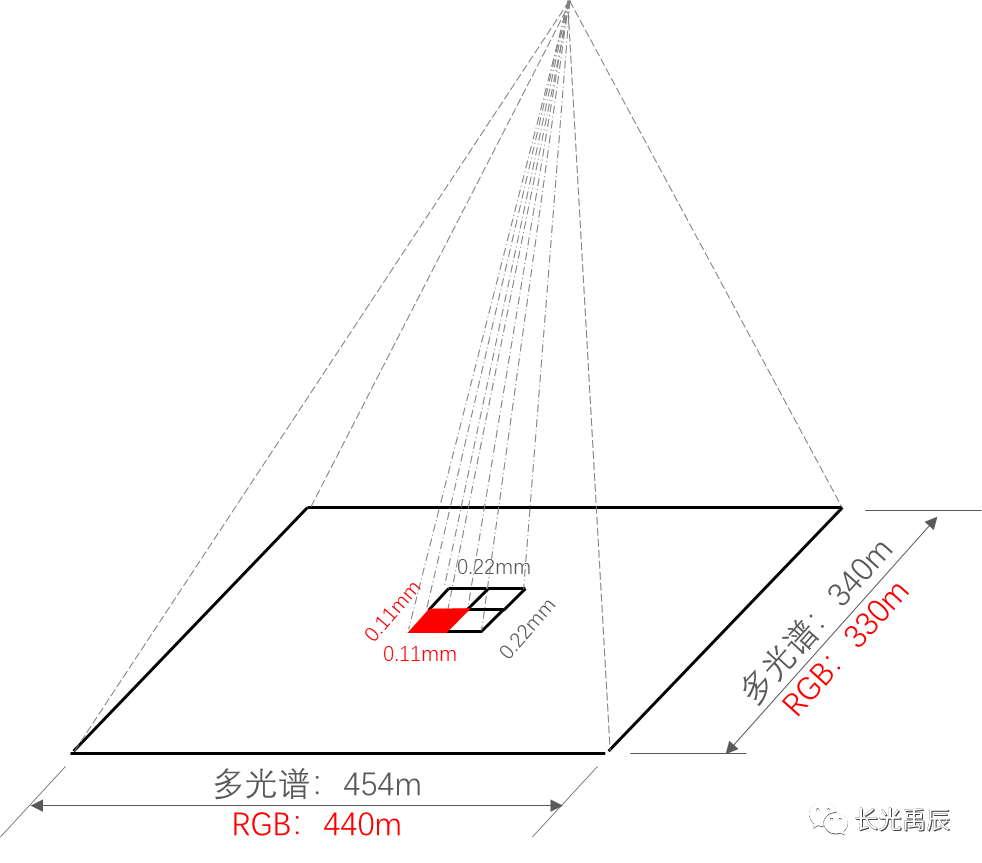 多光谱通道焦距7.8mm、视场48.8°×37.5°、地面分辨率0.22m@h=500m、覆盖宽度454 m×340m@h=500m;RGB通道焦距7.2mm、视场47.4°×36.4°、地面分辨率0.11m@h=500m、覆盖宽度440m×330m@h=500m。