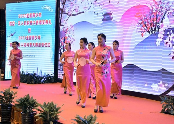 在今天的仪式上,奉贤区政府有关部门还为仪式奉献了精彩纷呈的“东方旗袍”歌舞,得到了参会者的高度赞扬,为全场带来了欢快,同时也表达了大家对2020全国青少年航空·无人机科普大赛取得成功的喜悦和对2021全国青少年航空·无人机科普大赛的殷切期待和美好憧憬。