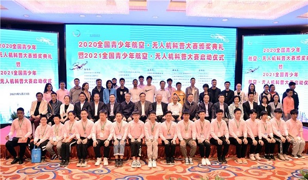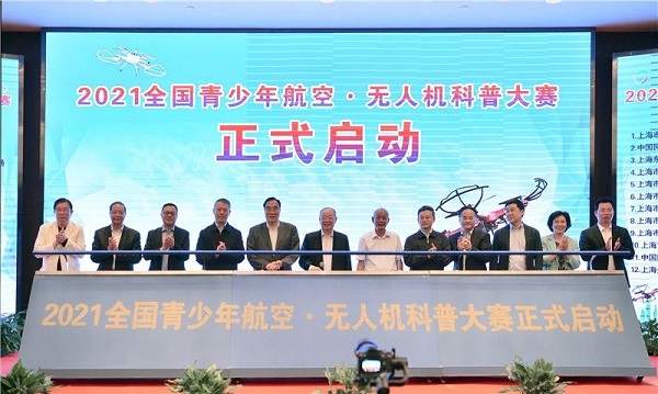 领导嘉宾共同推动启动杆,炫目的“2021全国青少年航空·无人机科普大赛”几个彩金大字顿时出现在启动台和大屏幕上,标志“2021全国青少年航空·无人机科普大赛”正式启动。