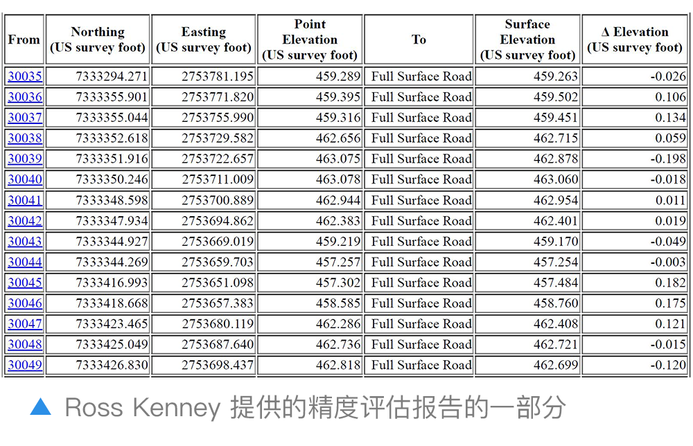 为了获得LiDAR地表图相对于GNSS点(探测器在现场拍摄所得)的精度评估,Kenney将GNSS位置数据与点云进行了比较,得出了令人印象深刻的结果。Kenney解释说:“在70张校验照片中,对所有这些点求平均值后,你将发现垂直方向的总体精度平均在0.05到0.10英尺之间。就是说在该特定区域,垂直精度达到了1.5厘米到3厘米。能用这种成本的无人机测量系统达到这种精度,是非常惊人的。”