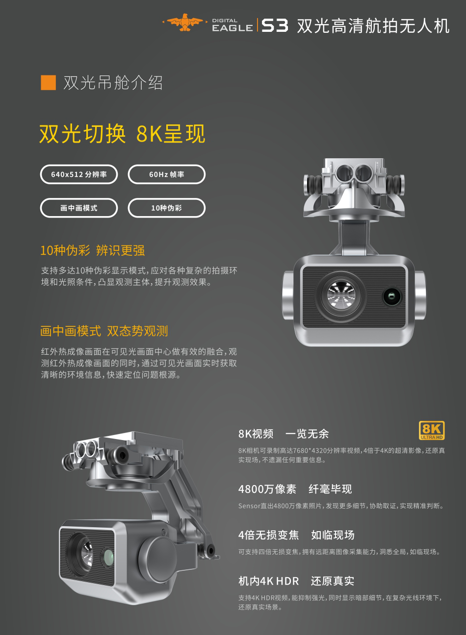 新款S3双光高清无人机续航38分钟、九公里图传、8级抗风能力、20m/s飞行速度,可适配多种载荷,具备强大的作业能力。