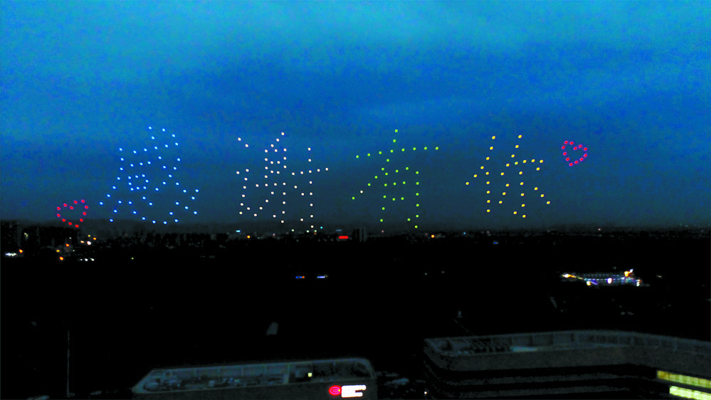 当晚20时整,伴随着音乐,200架无人机缓缓上升,它们以夜幕中的成都为背景,铺展出一幅幅震撼人心的“爱心”画卷,璀璨的灯光绽放夜空,“成都市血液中心吉祥物闷墩儿”“热血成都”“感谢有你”等图形字样相继在空中展开,致谢每一位献血者!