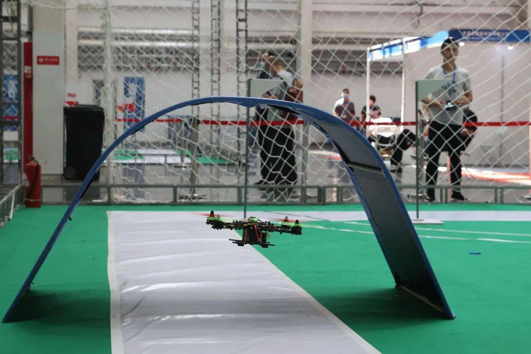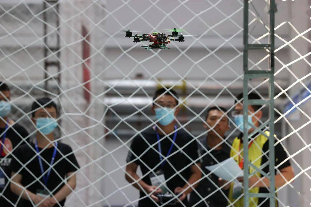 △参加2021年全国无人机技能创新大赛的选手在遥控一架无人机穿越障碍