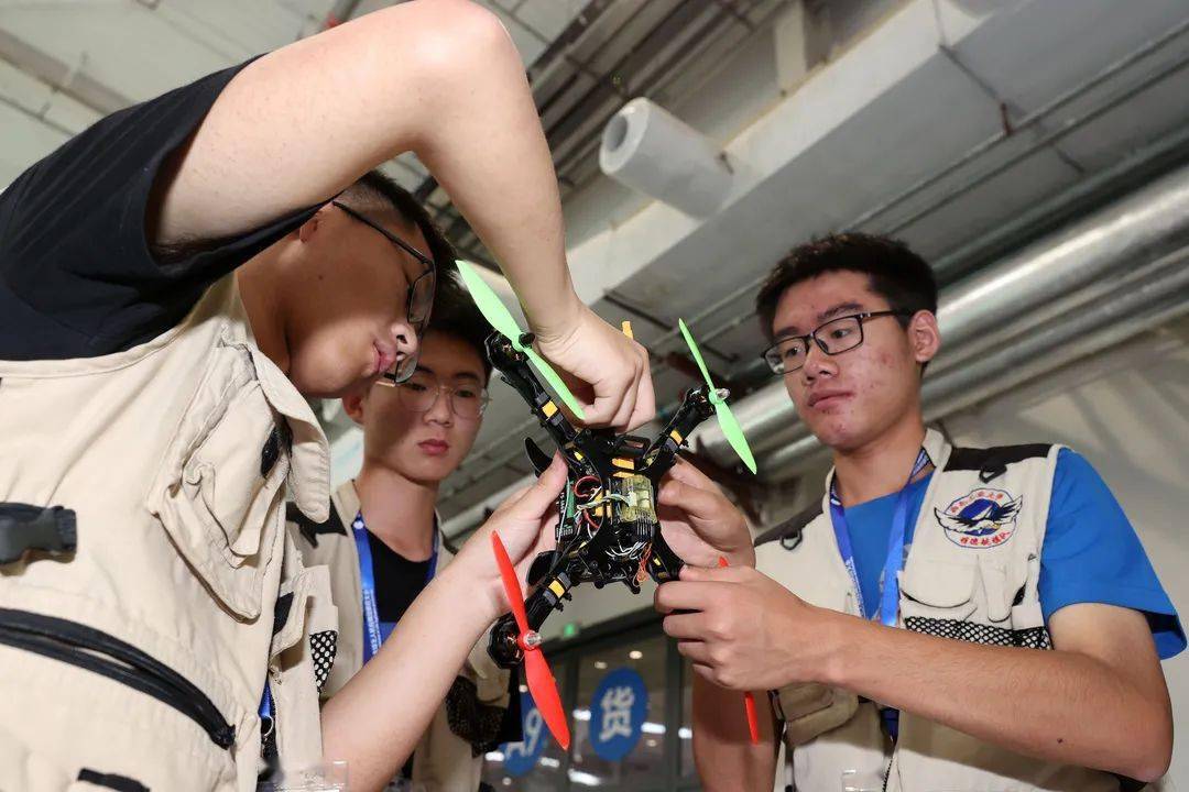 △参加2021年全国无人机技能创新大赛的选手们在一起组装无人机