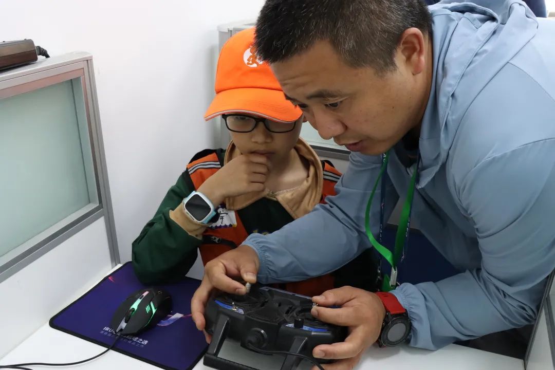 最后,在老师专业的指导下,小记者们亲自操作了室内穿越机。小记者们既紧张又激动,在老师的帮助下完成了操控无人机的起飞和转向飞行小任务,对无人机的飞行有了正确感知。