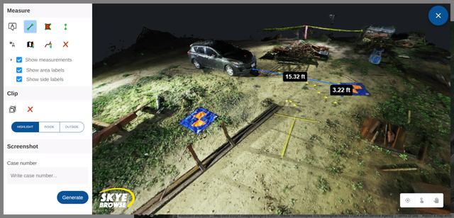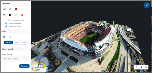据称,SkyeBrowse所绘制的3D模型精度达到厘米,该公司还发表了白皮书将其精度与行业标杆Pix4D和徕卡(Leica)进行了比较。而生成3D模型后,你还可以在SkyeBrowse查看器中测量距离、高度和面积。并能对模型进行截屏并对模型进行注释。