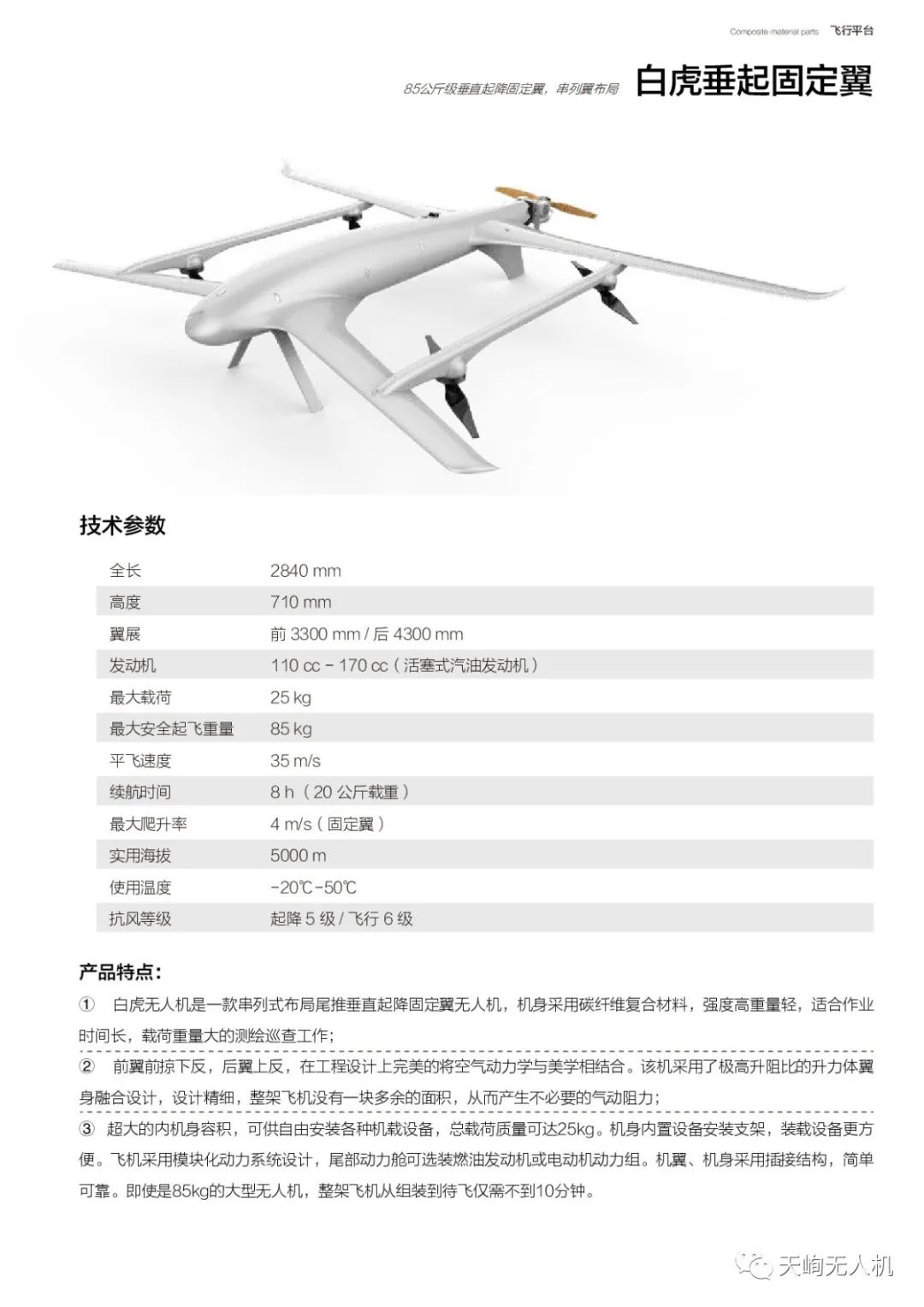 (白虎,新型串列翼垂起无人机,大荷载,长航时:起飞重量85kg, 载重25kg,航时8h)