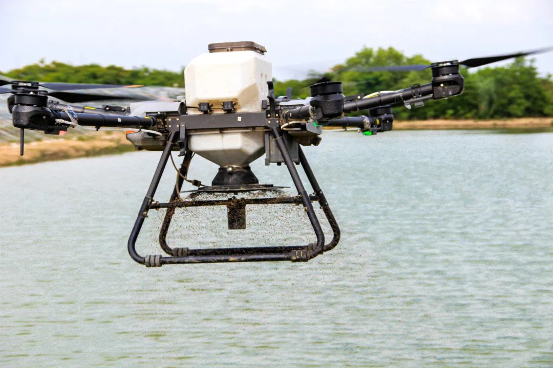 近年来,从植保施肥到授粉、龙虾喂料、油菜和水稻播种,无人机活跃在农业生产的各个领域,受到使用者的广泛好评。用无人机进行虾塘喂料,张国良是海宁吃螃蟹的第一人。虾塘喂料采用的是大疆公司最新研发的扫边模式。在该模式下,无人机的飞行速度5.5米/秒,高度1.5米,转速200转/秒,饲料播撒的幅宽则限定在2米,可以精准高效的进行饲料投喂。目前我市无人保有量已超过80架,无人机在农业领域的广泛使用,深刻改变了传统生产模式,有效助推了我市农业“机器换人”建设。