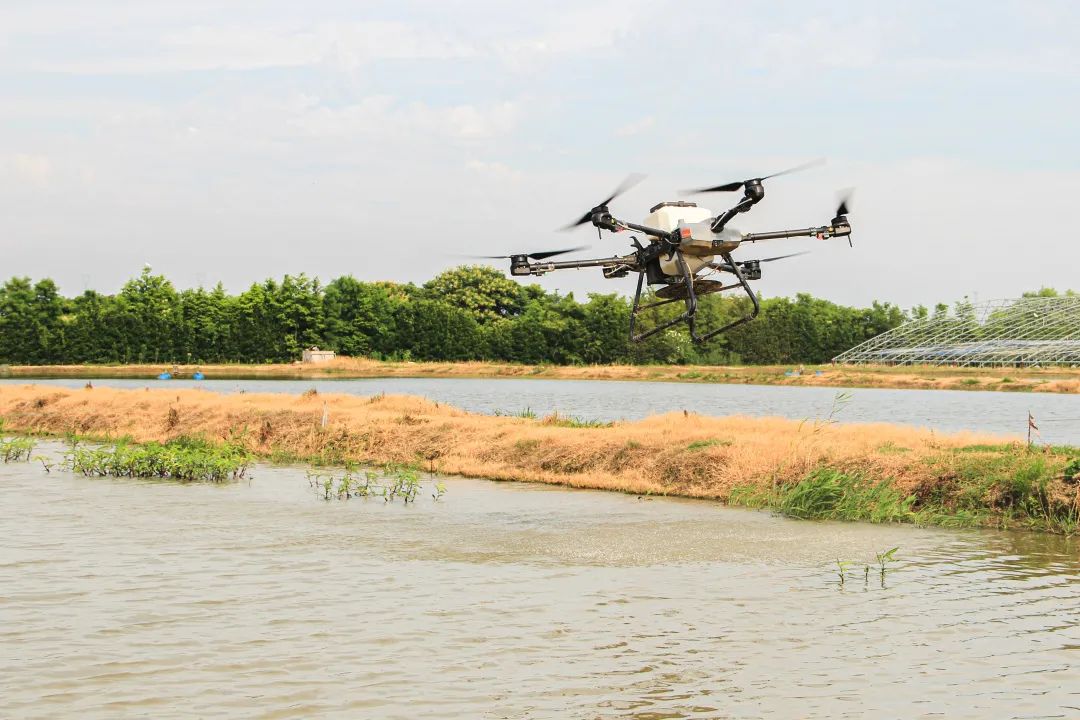 近日,在海宁市马桥街道民胜村嘉辉家庭农场的虾塘上方,一架大疆T30无人机正在水面上空快速飞行,颗粒状的饲料从药箱中旋转而出。不到两分钟的时间,无人机已自动绕虾塘飞行一周,顺利完成了整个虾塘的投喂工作。