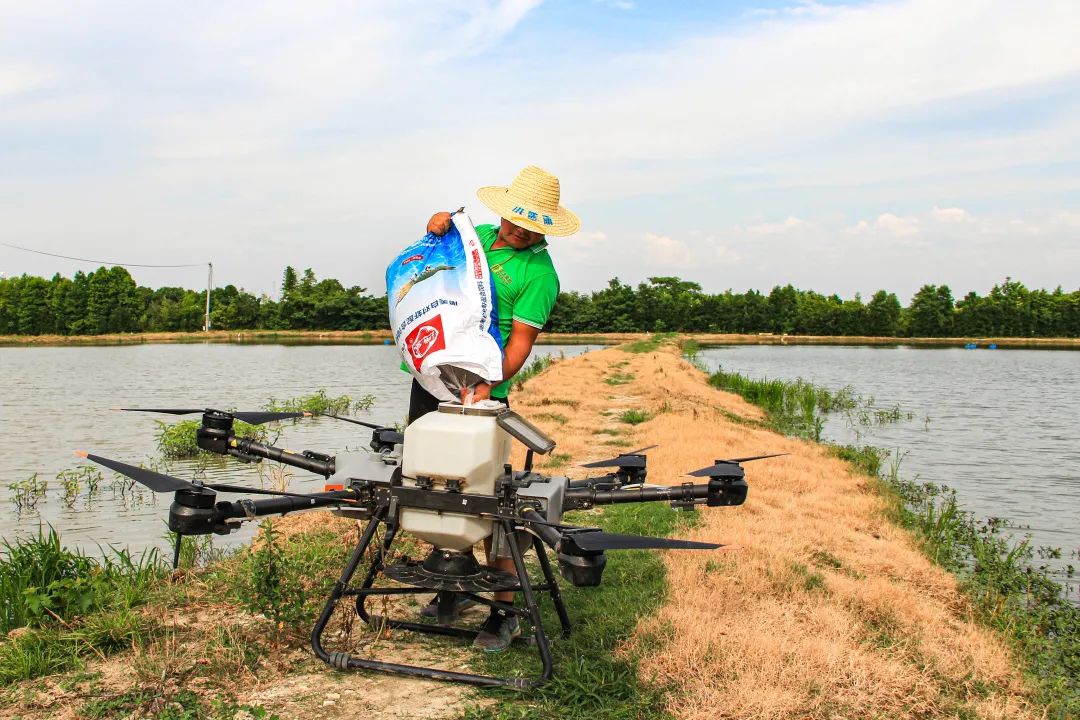 当问及使用该无人机喂料的感受时,张国良满面笑容滔滔不绝向大家介绍:“我在这边承包了170亩虾塘,养殖规模算比较大的。以前都是手工喂料,上下午各一次,每次要花3个小时,平时需要雇3个人才勉强忙得过来。有了这架无人机后,只要事先把投料轨迹设置好,整个喂料过程中,只需要操作好它的起停,及时做好饲料填补和电池更换,我一个人,花不到1个小时的时间,就轻轻松松完成全部虾塘的喂料,效率真的太高了。虾塘养虾,饲料既不能喂多,也不能喂少,手工喂料无法精准掌控,有了这架无人机,可以通过调整参数来设置亩喂料量,实现精准投喂。另外,每年5月中旬到10月中旬的养殖期间,是雨水较多、温度较高的时期,工作环境比较恶劣,高峰期一次要喂1500斤饲料,劳动强度很大,无人机的使用,大大减轻了劳动强度,轻轻松松就能完成了喂料。最重要是,有了这架无人机,除去投入成本,光人工费这一项,每年就省下了五万余元。