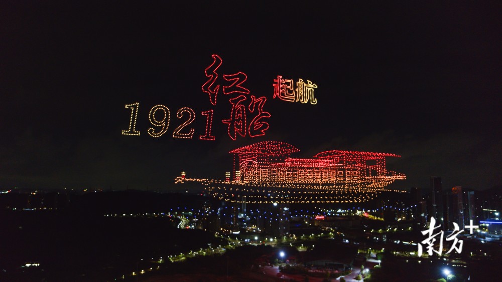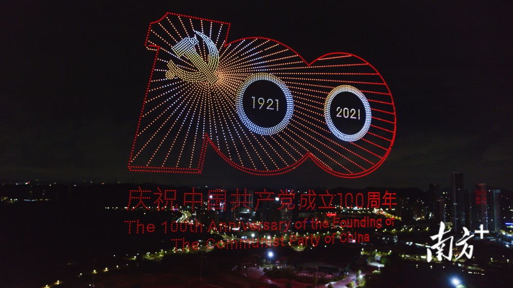 来自龙岗的无人机列队变换出88个队形,以天为幕,以光为笔,勾勒出从1921年至今的百年奋斗征程。