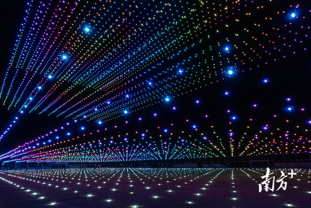 夜幕降临,深圳龙岗大运体育中心上空,5200架无人机腾空而起,随着歌曲和灯光布阵交错起落,点亮一方天际。