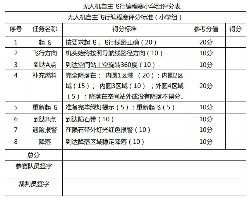 比赛共分为两个阶段,第一阶段为现场编程调试阶段,第二阶段为程控飞行阶段,每名选手有2次飞行机会。