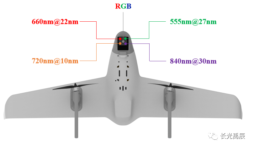 4个1.3M像素多光谱(像元大小 2.7μm,12bit量化全局快门)+1个8.0M像素RGB(像元大小1.12μm,8bit量化卷帘快门)的通道组配,大光圈、低畸变、宽带透射镜头,120m航高幅宽80m×67m(多光谱)/ 82m×61m(RGB)、像素分辨率 6.23cm(多光谱) / 2.49cm(RGB),更高的光谱测量精度、更高的空间分辨率,助力精准农业多光谱遥感的科研和生产。