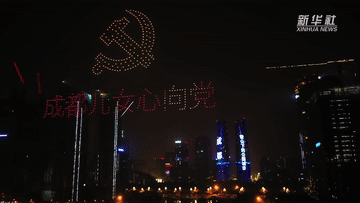 “七一”来临之际在成都高新区的上空500架无人机变换阵列与此同时天府立交桥 五岔子大桥金融城天府双塔 环球中心等多个当地地标性建筑上演灯光秀光影璀璨十分炫酷