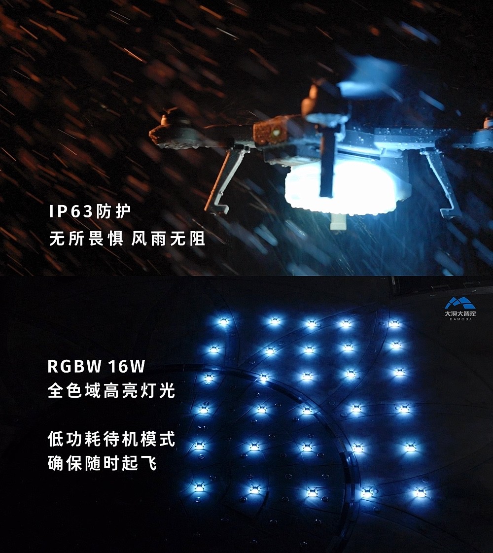全新一代产品在防水、抗风和续航方面完成了重大突破。在续航方面,单机续航时长可超过26分钟,表演时长可达18分钟,并采用全色域RGBW灯光,其功率也提升到了16W;并且新产品在表演过程当中的间距更小,速度更快,同时,保持上一代无人机编队产品的多功能负载系统,可以搭载焰火,激光,投放装置等多种模块,可以在夜空中呈现更为立体,惊艳,丰富,美观的无人机编队内容。