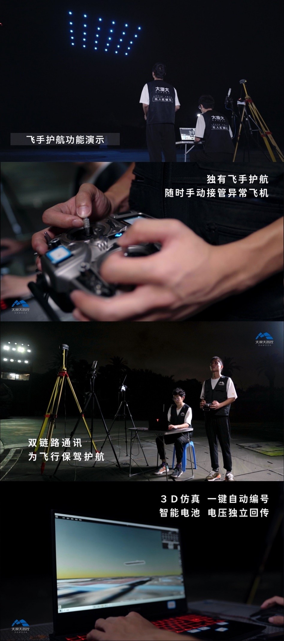 “天玑”沿袭了大漠大研发团队和执行团队“稳定、安全、不坠机”的产品基因,配备大漠大在业界独有的“飞手护航”无人机编队表演安全解决方案,同时标配双链路通讯技术,为飞行保驾护航。在软件方面,延续采用“3D仿真,一键自动编号”并配合智能电池系统,能够更稳定、安全、高效地执行无人机编队表演。除此之外,“天玑”产品配备了全新版本的“一站多编队”通讯控制技术,仅用一套地面基站可以控制多个编队,并使不同编队“合多为一”进行表演,创造了全新框架下的无人机编队表演模式,极大丰富了无人机编队灯光表演的呈现形式和表演内容。