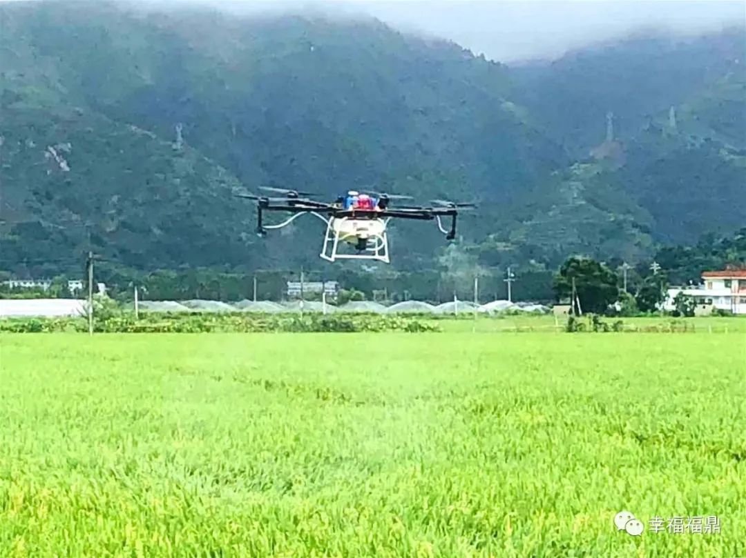 太姥山镇下尾村稻田里,在操作人员的遥控指挥下,无人机螺旋桨飞速旋转,盘旋在绿油油的稻田上空,几分钟就完成了一大片稻田的病虫害防治。