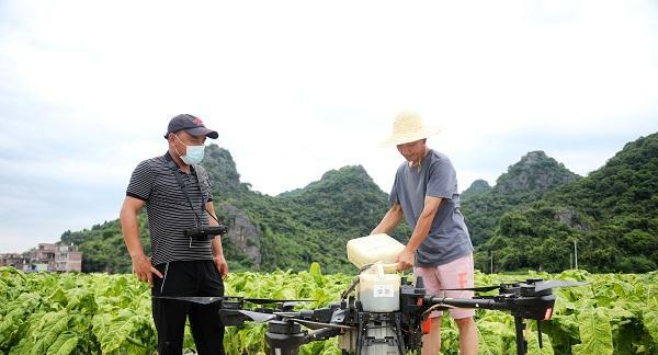 在石羊镇的烟叶生产基地里,一架无人机在烟田上空来回穿梭,将雾化的农药均匀地喷洒在烟叶上。据工作人员介绍,每台无人机一天的作业面可达500亩,工作效率是人工喷洒农药的50倍,无人机飞防相较于传统作业方式农药浪费更少、喷洒更加均匀、生产成本更低,且这种无接触式的无人机飞防方式安全性更高,病虫害防治效果也更好。