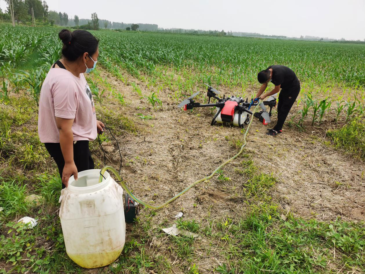 孙会和郝团结夫妇共计承包了1000多亩农田,种植玉米、小麦和红薯等农作物。这么大规模的农田就单种植一季玉米,算上除草、杀虫还有撒肥至少也得进行4到5次植保作业,在过去要想不误农时,就得请人或者租用大型机械设备。但人工打药成本高,还有中暑的风险;拖拉机式的打药器又容易碾坏庄稼,100亩农田就浪费3亩地的粮食。因此,在亲身体验到农业无人机的高效后,孙姐今年就干脆自己买了两台。