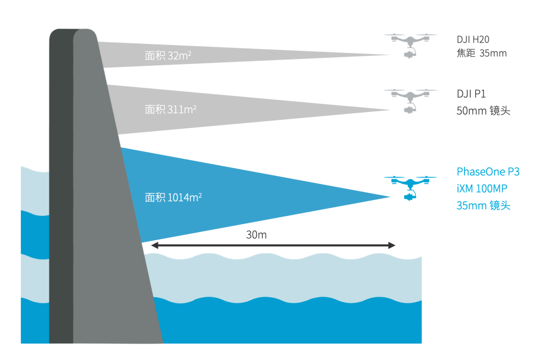 相比常见的民用相机和全画幅工业相机,Phase One工业相机画幅更大,一张照片可以覆盖更大的视野范围和场景。特别是对于变电站而言需要检测的点很多,如果使用全画幅相机需要多点定位,一个小变电站通常要用无人机飞行一天多时间,拍摄近百张照片才能完成,期间还要不停换电池以确保安全飞行。而飞思中画幅高精度相机则能很好的改善这一过程。由于传感器面积大,视野广泛,仅拍摄几张照片即可完成作业任务,同时又能保证视场的清晰度。大大节省了业主方的作业时间和作业流程。