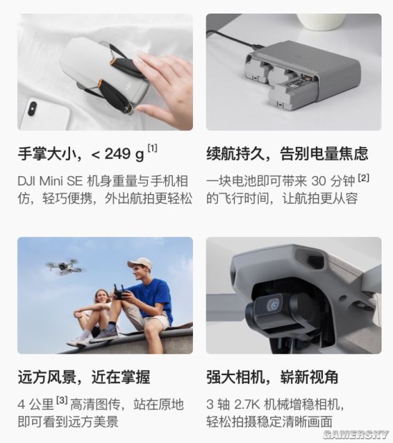 本月初,大疆在海外发布了新款无人机——大疆MINI SE,这款新品的机身非常轻巧,仅有249克重。近日,大疆MINI SE在国内正式开售,售价1999元。