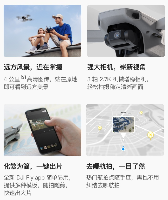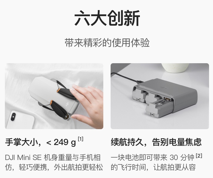 大疆 MINI SE 重量仅为 249 克,与手机相仿,轻巧便携,一块电池即可带来 30 分钟的飞行时间,支持 4 公里高清图传。其内置了 3 轴机械增稳相机,采用1/2.3英寸的传感器设计,像素为1200万,最大视频拍摄能力为2.7K 30fps。