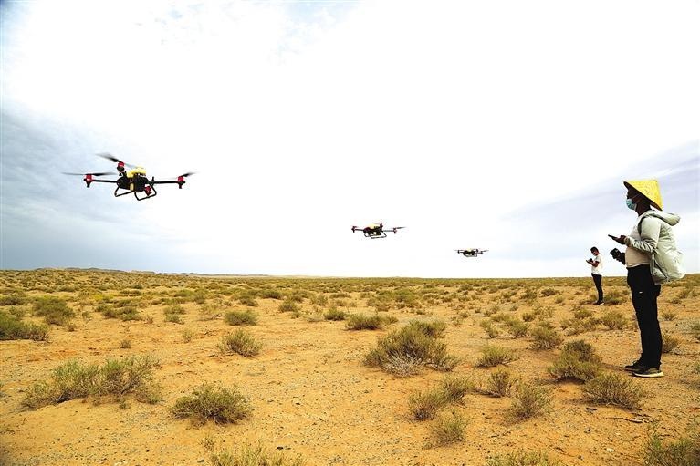 8月7日,在张掖市临泽县平川镇北部荒漠草原上,甘肃蒲沐农业科技发展有限公司技术人员操作植保无人机开展有害生物防治作业。