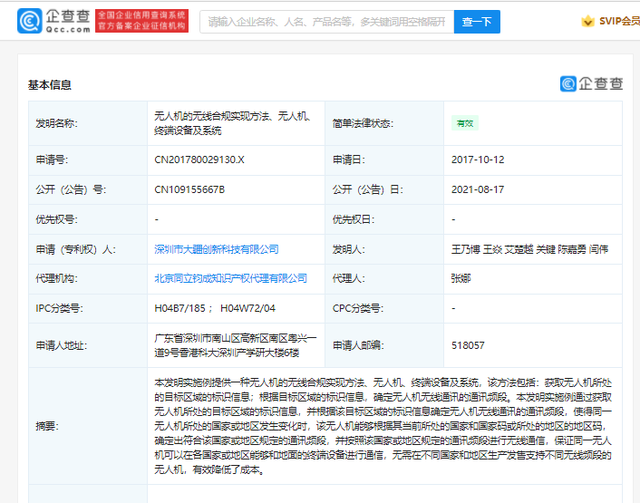 企查查APP显示,8月17日,深圳市大疆创新科技有限公司获得“无人机的无线合规实现方法、无人机、终端设备及系统”专利授权,公告号CN109155667B。企查查专利摘要显示,该无人机能够根据其当前所处的国家和国家码或所处的地区的地区码,确定出符合该国家或地区规定的通讯频段,并按照该国家或地区规定的通讯频段进行无线通信,保证同一无人机可以在各国家或地区能够和地面的终端设备进行通信,无需在不同国家和地区生产发售支持不同无线频段的无人机,有效降低了成本。