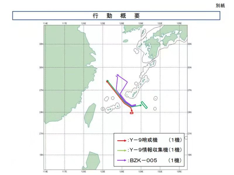 根据日本防卫省公布的飞行路线图显示,这3架中国军机在飞行途中通过了宫古海峡上空。日本防卫省称,日本自卫队的战斗机紧急出动进行应对。