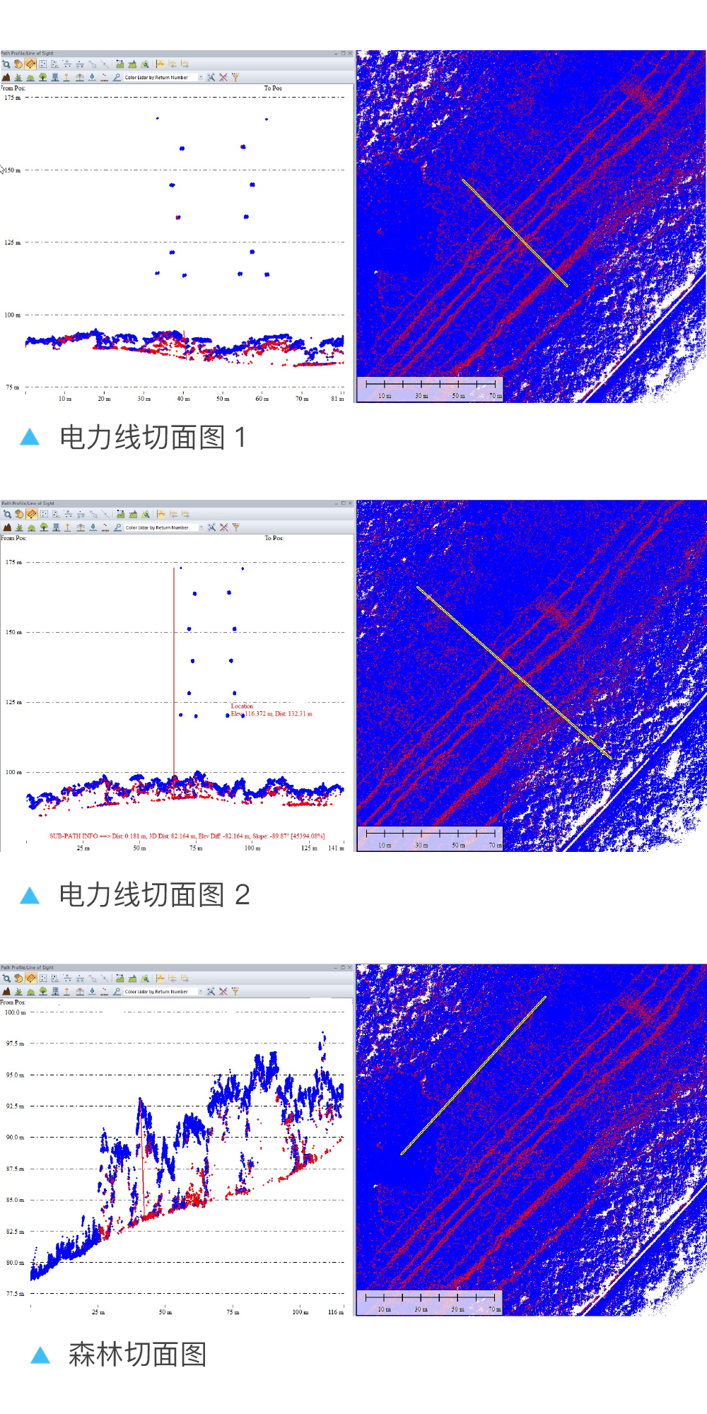 最后测试人员检查了切面图。在电力线切面图中,6 - 7 根电线完整呈现。而在树林切面图,可以看到新系统的穿透性良好,地表趋势完整、清晰。
