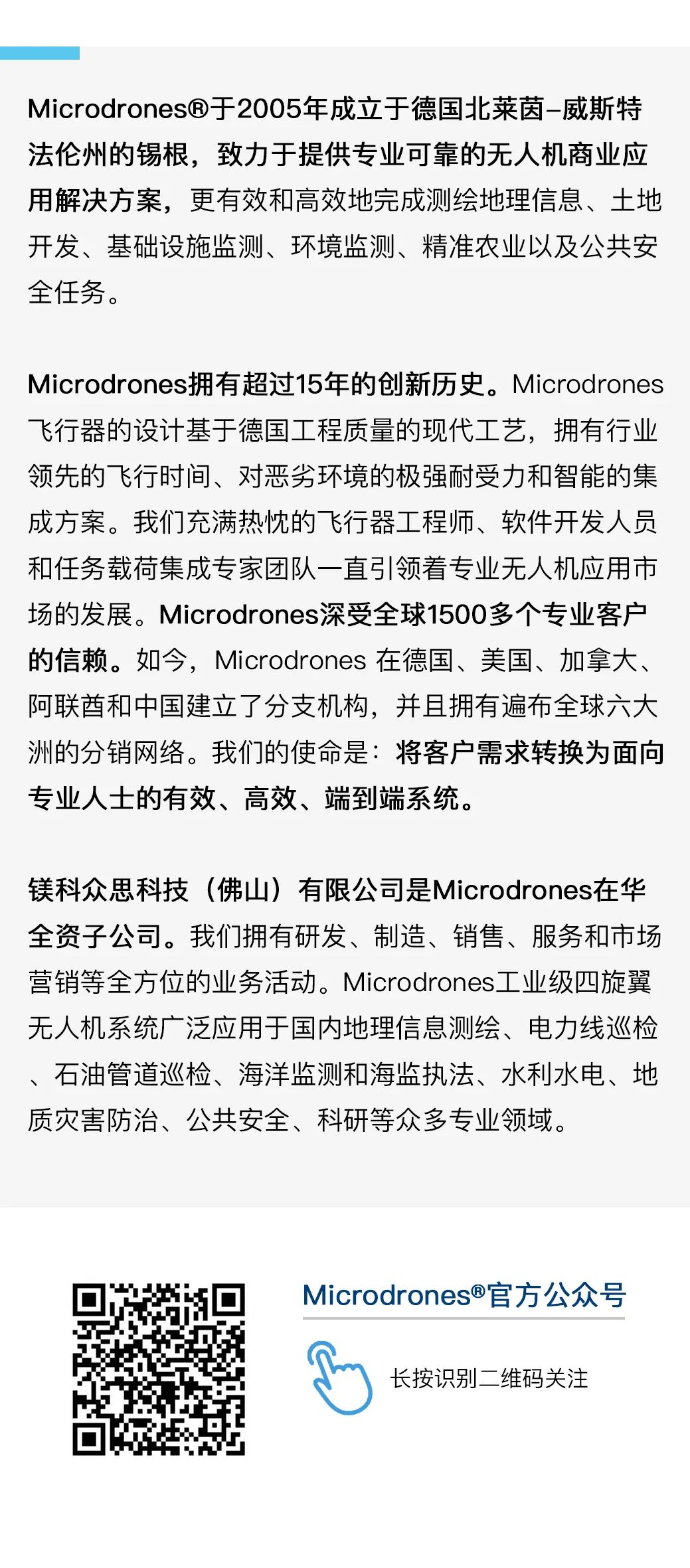 如需了解更多新款 mdLiDAR1000LR 测量套装的信息,欢迎识别下图二维码(或点击【阅读原文】,进入 Microdrones 公众号产品中心,查看详情和下载产品文档。