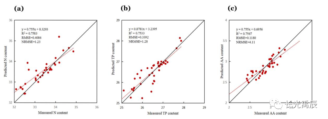 在此背景下,青岛农业大学园艺学院丁兆堂教授科研组采用无人机搭载MS600多光谱相机,获取了茶树冠层多光谱图像,并结合机器学习方法对茶树氮素、茶多酚和氨基酸含量进行了估测。通过建模对比和系数验证,结果表明,实测地面参数与模型估测结果一致性较高。