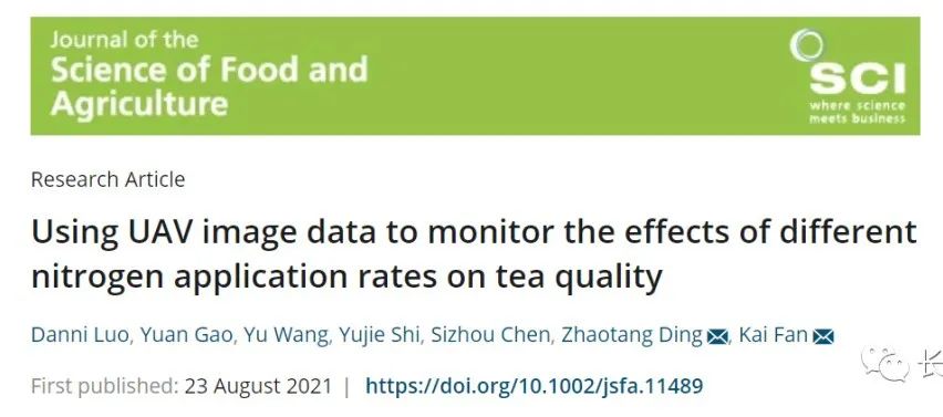 青岛农业大学园艺学院丁兆堂教授科研组在JSFA发表了题为Using UAV image data to monitor the effects of different nitrogen application rates on tea quality 的论文,此研究采用配备长光禹辰多光谱相机(MS600, Yusense, Inc.,Qingdao, China)的四旋翼无人机(MATRIX 200 V2, DJI, Inc., China)获取多光谱图像,利用机器学习方法对茶树氮营养与品质指标进行了估测。