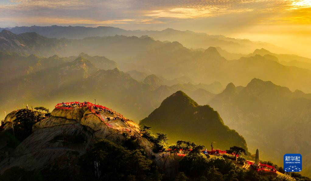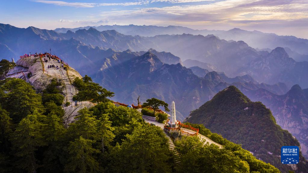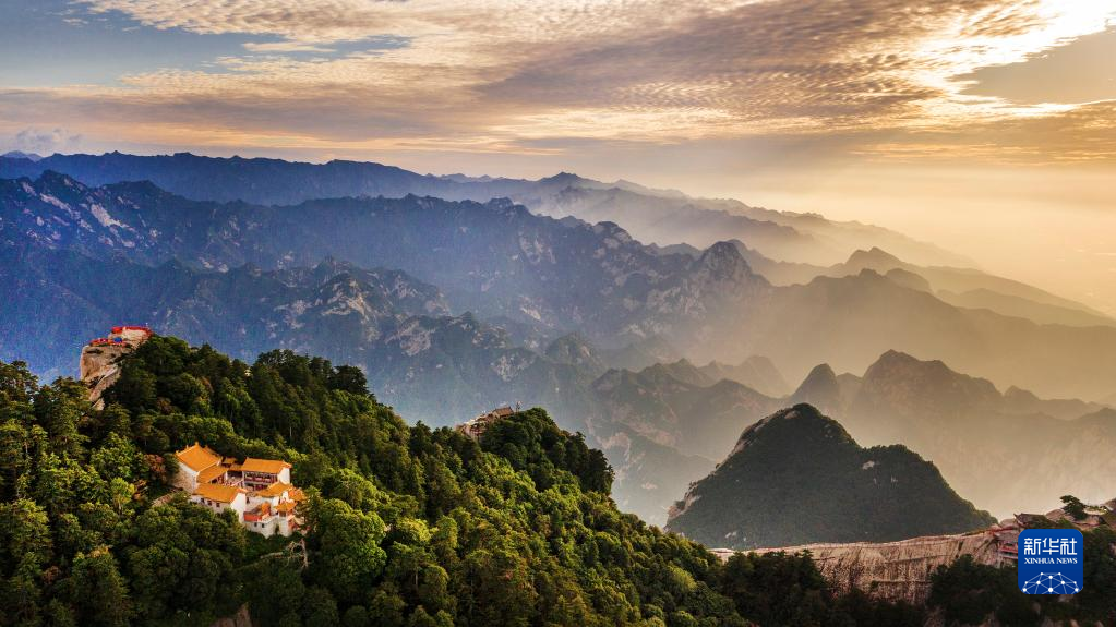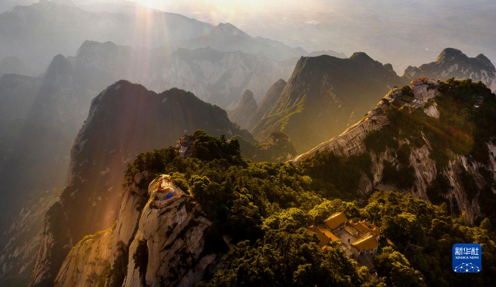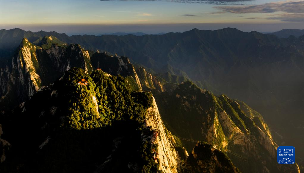 6月19日,晚霞映照着华山(无人机照片)雨后初霁,位于陕西省华阴市的西岳华山在晚霞映照下,风光壮美。新华社记者 陶明 摄