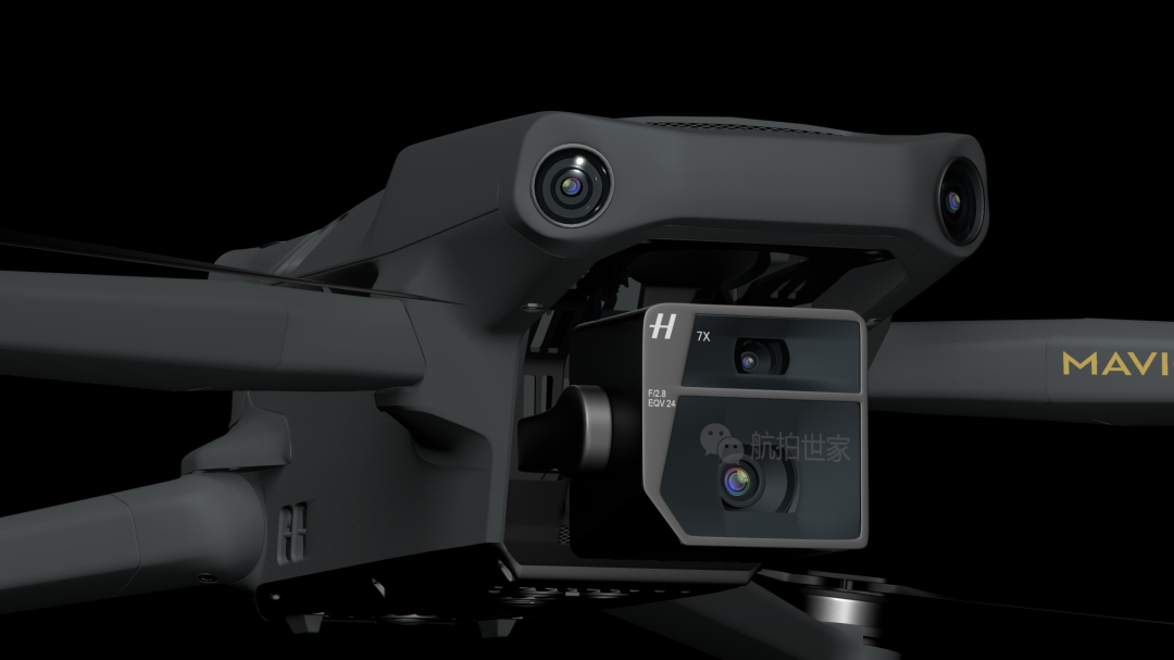 根据海报显示,该无人机将配备双哈苏相机。Mavic 3 Pro 的主摄像头将配备微型四分之三 (M4/3) 传感器,类似于专为 Inspire 2 无人机设计的 DJI Zenmuse X5S 专业云台相机。同时,Mavic 3 Pro 的辅助摄像头预计将配备 ½ 英寸传感器。该辅助摄像头将配备 7 倍光学变焦镜头,可为无人机配备 28 倍混合变焦功能。