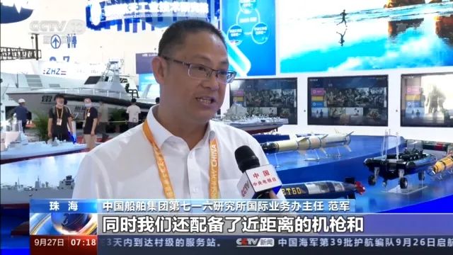 中国船舶集团第七一六研究所国际业务办主任 范军:我们配置了垂直发射的对海导弹,这是一个最大亮点,在这么小的船上应该说不多见,同时我们还配备了反潜的鱼雷,能够打击5到8公里水下的小潜艇。同时我们还配备了近距离的机枪和小(轻型)导弹用于对付对陆和对海的小目标。负责人还介绍,作为一款为适应军贸出口需求而研制的无人装备,这款船艇采用功能模块化及平台一体化集成设计,在实际操作中,通过配置不同的传感器和武器载荷,使用卫星遥控,便可实现对无人作战艇航行、作战的一体化、智能化控制。