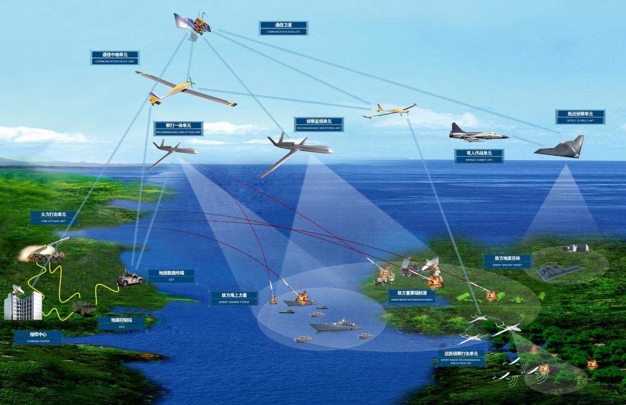 无人作战体系包括通信中继单元、察打一体单元、侦察监视单元、抵近侦察单元、近距离打击单元以及配套的地面数据终端、地面控制站等,体系中的无人装备既可独立作战,又能为其它精确打击武器提供实时作战信息支持,可用于海防、边防、反恐和局部冲突中信息保障和快速打击,也适用于地区常态监视、侦察、信息中继。在持续的优化改进中,又将无人作战体系细化为超高空、高空和中低空三个层级。