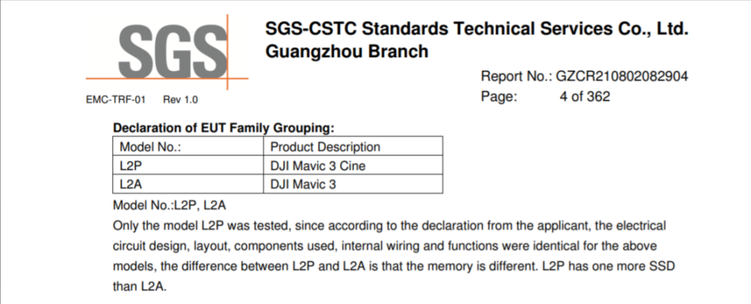 根据申请人[大疆]的声明,上述机型的电路设计、布局、使用的元器件、内部布线和功能都是相同的。L2P和L2A的区别在于,内存不同。L2P比L2A多了一个SSD。