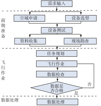 本次测量采用中为卢龙一号无人直升机,同时搭载RIEGL mini VUX-1UAV激光雷达、TR5100五拼相机。无人机数据采集飞行服务的作业过程分为前期准备、飞行作业、数据处理三个阶段。实施流程图见图2。