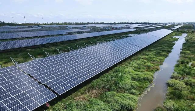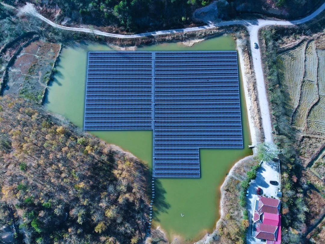 所谓“渔光互补”,就是将水产养殖与光伏发电结合,在水域上方架设光伏面板,在面板下进行养殖,形成“上可发电、下可养鱼养蟹”的发电新模式。此项目的落地,不仅高效利用土地,同时生产出大量的清洁能源,平均年发电量达4576万千瓦时,年减排二氧化碳达8.89万吨,为生态发展做出示范。