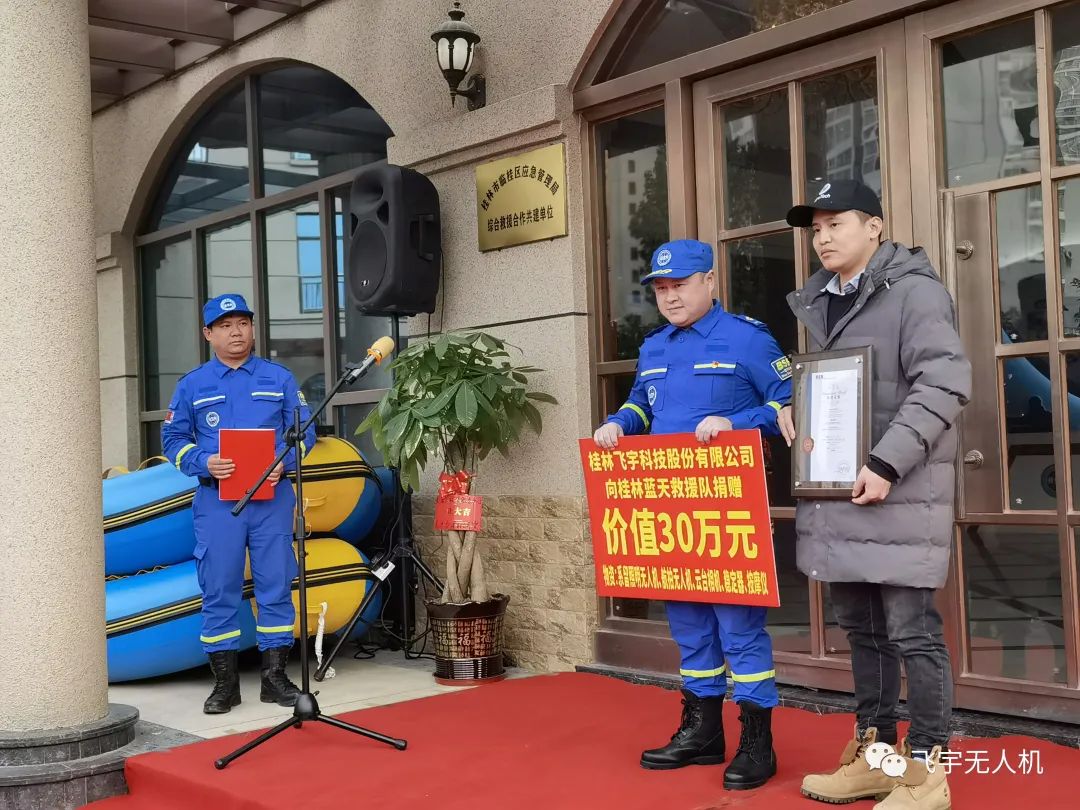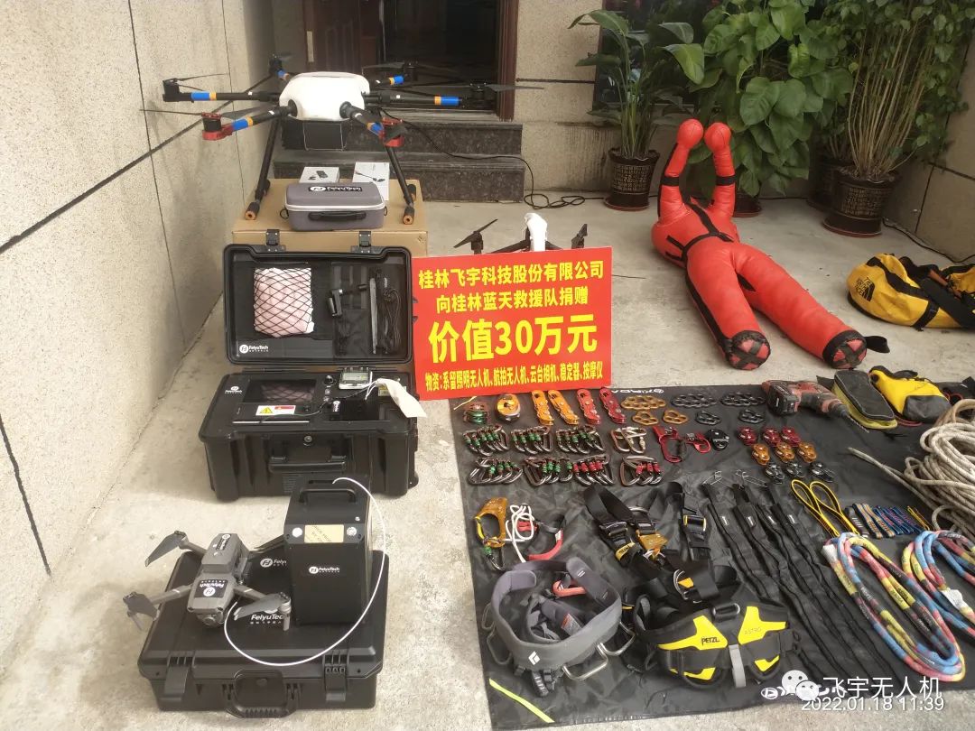 桂林飞宇科技股份有限公司(以下简称"飞宇科技")向桂林蓝天救援队捐赠价值30万元夜间照明系留无人机、航拍无人机、相机云台、手机稳定器、筋膜枪等救援设备。