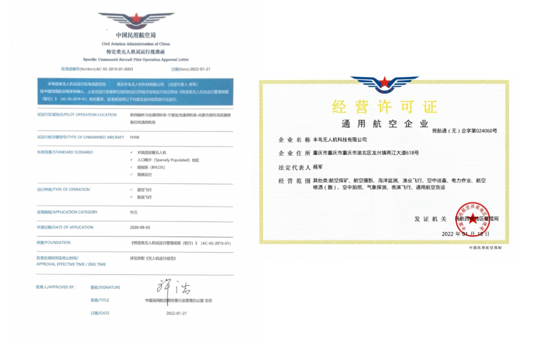 2022年1月25日,顺丰旗下大型无人机公司丰鸟科技正式取得了中国民航局颁发的支线物流无人机试运行许可和经营许可,标志着丰鸟科技成为全国首家可在特定场景下开展吨级大业载、长航时支线物流无人机商业试运行的企业,也成为全球首个运用特定场景运行风险评估方法获得监管方批准进入支线物流商业试运行的大型无人机企业。